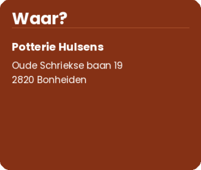 Potterie Hulsens is gevestigd in een bosrijke omgeving. De zaakvoerder zorgt voor een nette presentatie van je zowel kleinere gadgets als grote bewonderen en desgewenst aankopen. Vrij inlopen en benaderd door opdringerigheid. Je wordt desgewenst geholpen door de zaakvoerder.
